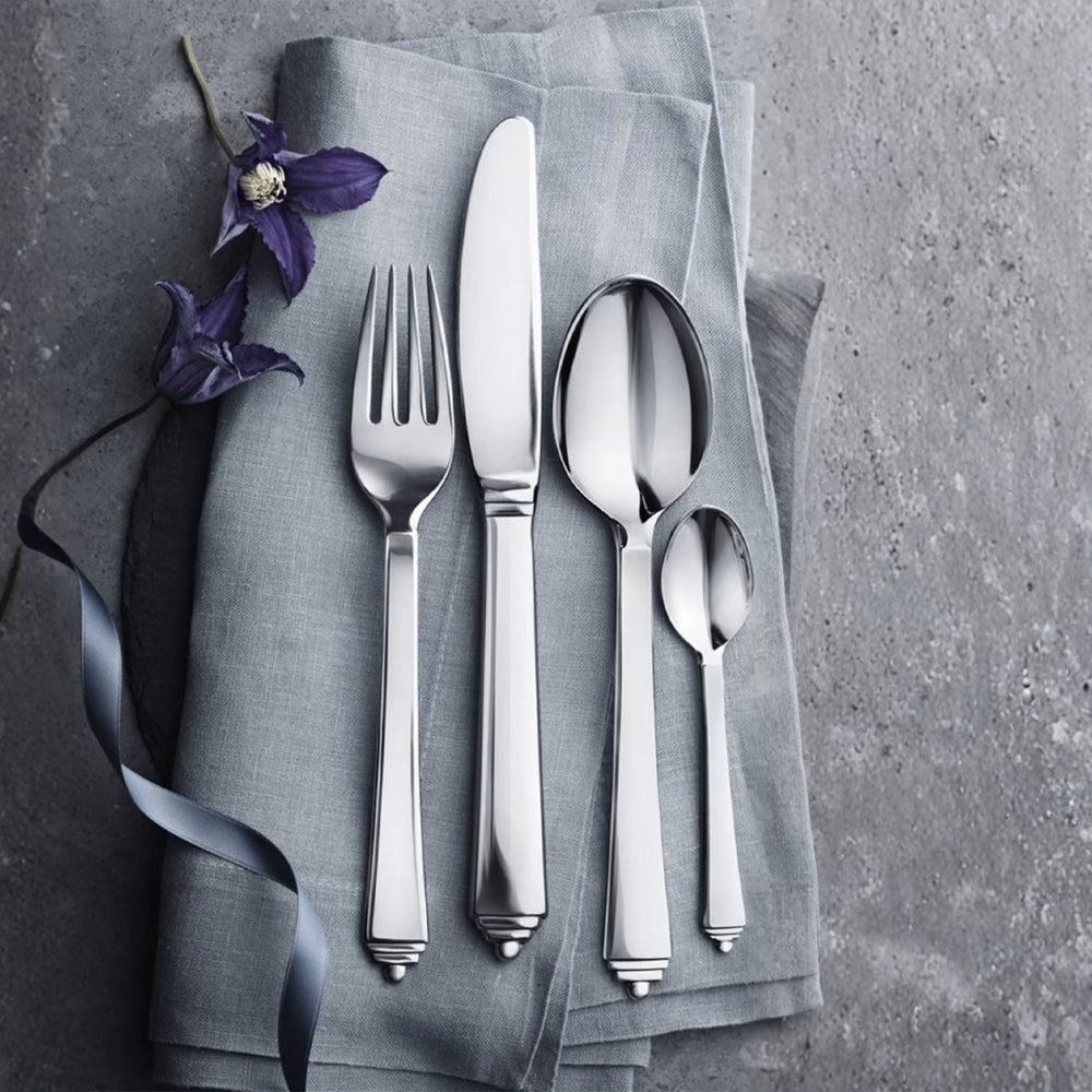 The unique stepped ziggurat motif that appears at the base of each handle of this Pyramid cutlery gives the set an unmistakable touch of the glamour and sophistication of Art Deco. Created in 1926 the design retains its timeless elegance and still brings classic beauty to the table top.