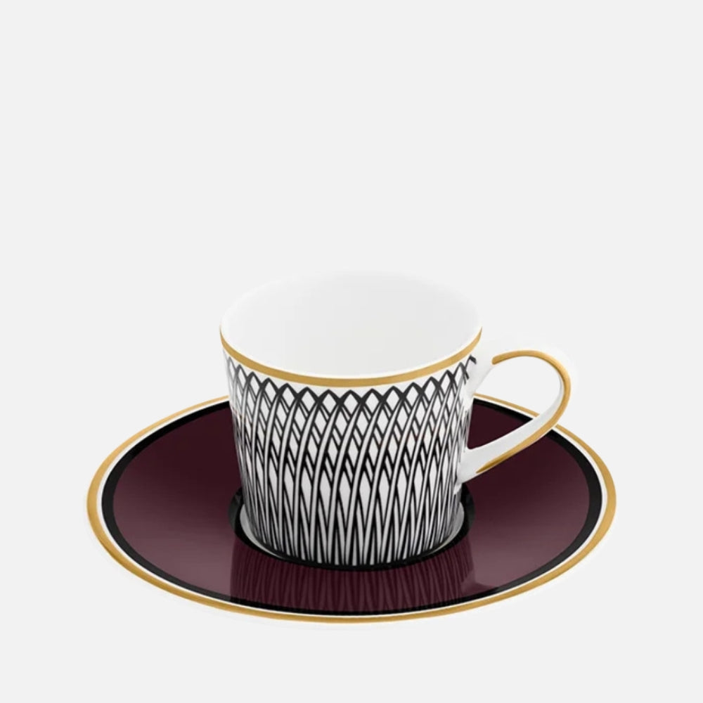 Crafted from fine bone china, the espresso cup and its matching 13cm saucer feature black curvy patterns and asymmetrical Art Nouveau lines set against a rich burgundy backdrop. A gold rim accentuates the design, adding a touch of opulence to every espresso moment.