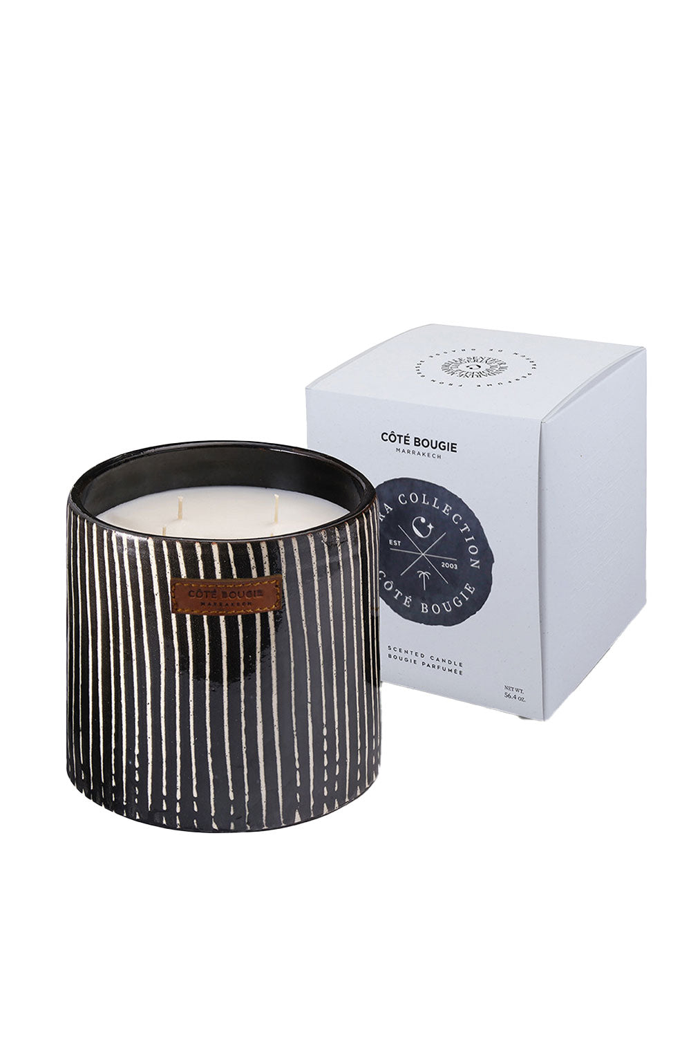 Zebra Black Scented Candle — a bold, refined piece crafted in Marrakech. The black ceramic jar features fine, hand-painted white stripes by skilled artisans, making each candle truly unique. Its elegant fragrance, created in Grasse, infuses your space with a sophisticated ambiance.
