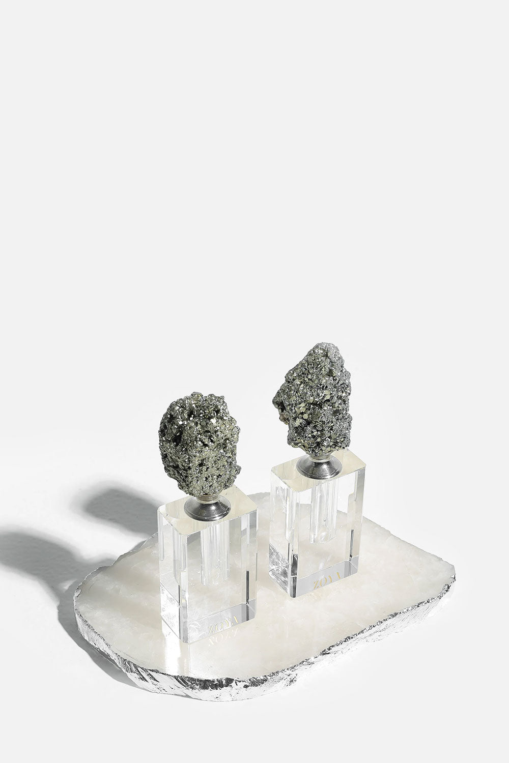 Material: Hand-carved natural stone bottles with glass vial inserts and pyrite gemstone toppers; White Quartz tray with silver detailing